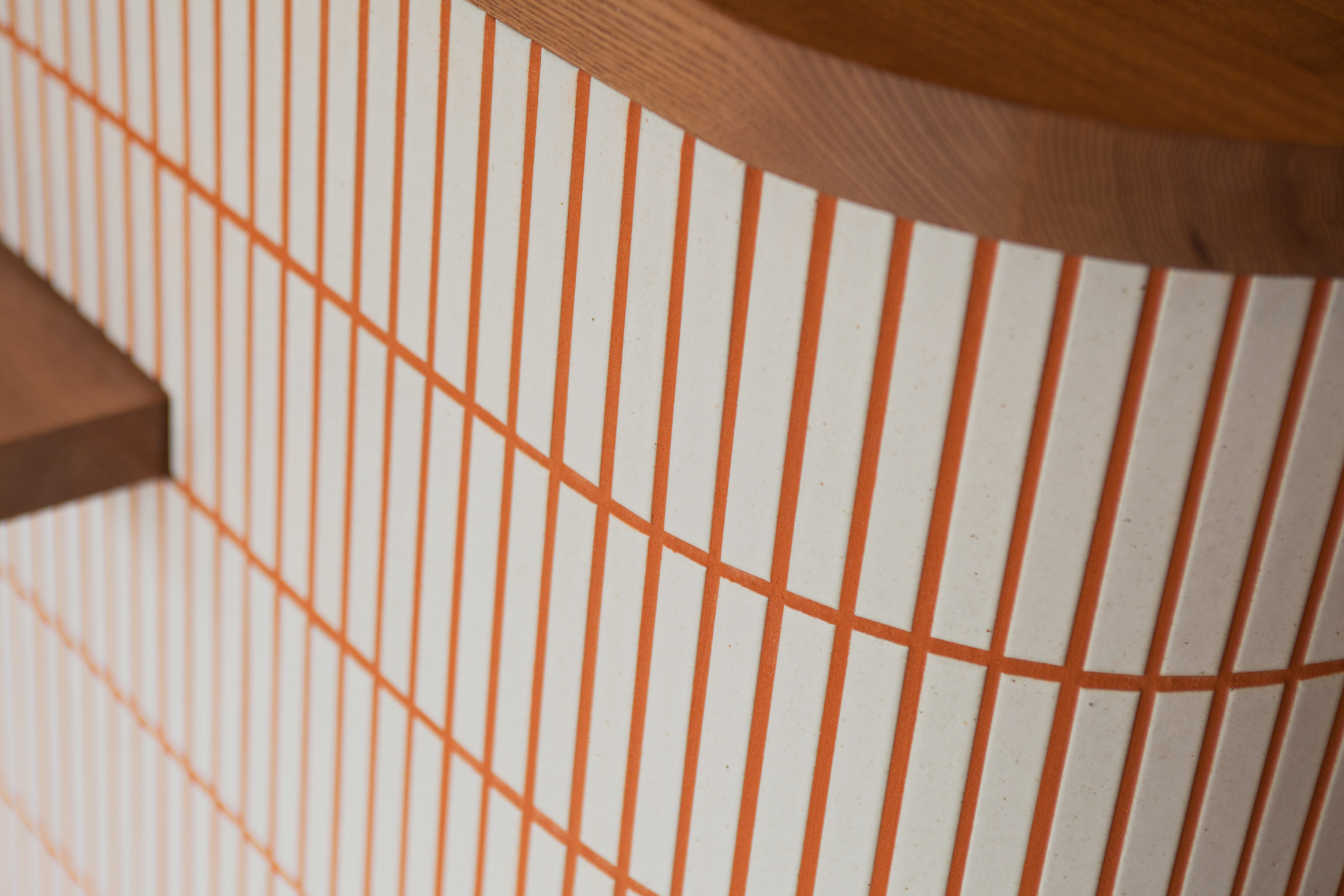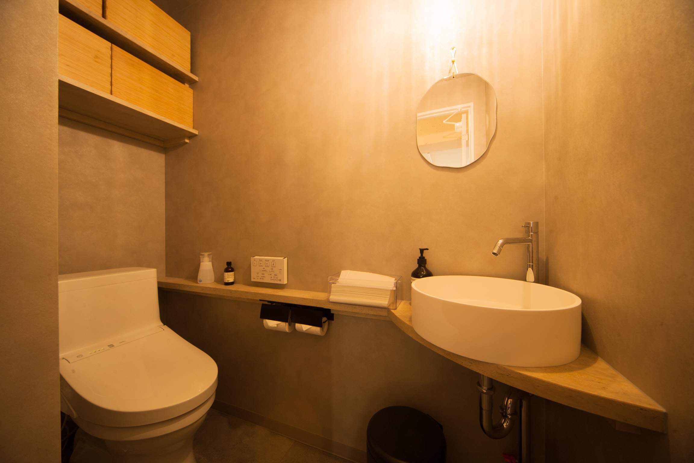 タイルやミラー、木の質感をバランスよく組み合わせ、シンプルながらも印象に残る仕上がりに。